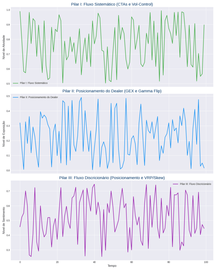 | Alerta Amarelo | GEX caindo perto de zero; IBOV próximo a gatilho de CTA; Vol Realizada subindo. | Redução de Risco: Feche posições vendidas em volatilidade. Considere estruturas de risco definido, como Travas de Débito, para apostas direcionais. |