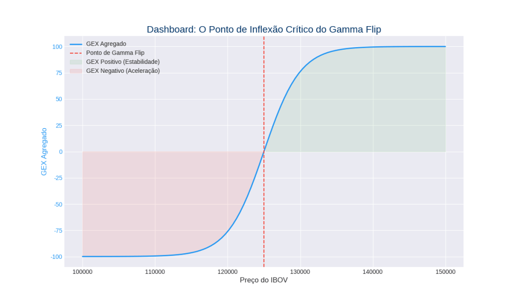O “Gamma Flip” é o nível de preço do IBOV onde o GEX agregado do mercado cruza de positivo para negativo. Acima desse ponto, o mercado tende à estabilidade. Abaixo dele, tende à instabilidade e a movimentos bruscos. Conhecer esse nível é saber onde o “chão seguro” termina.