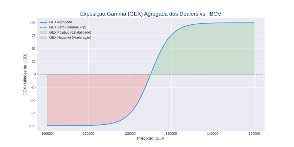 - GEX Positivo (Long Gamma): Os dealers, para se protegerem, precisam comprar na baixa e vender na alta. Isso suprime a volatilidade e tende a “prender” o IBOV dentro de um intervalo.