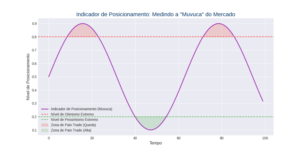 - Como funciona: O objetivo é identificar o “Pain Trade”. Se nosso indicador mostra que o otimismo está em níveis extremos (todo mundo comprado), o movimento que causaria mais “dor” ao mercado é uma queda.